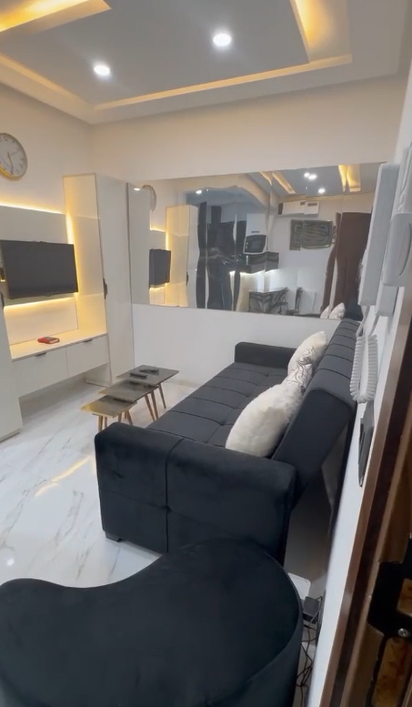 Studio S+0 situé à Cité Les Palmeraies, Tunis, comprenant un salon avec canapé-lit, une cuisine bien équipée, une salle de bain, et un balcon.