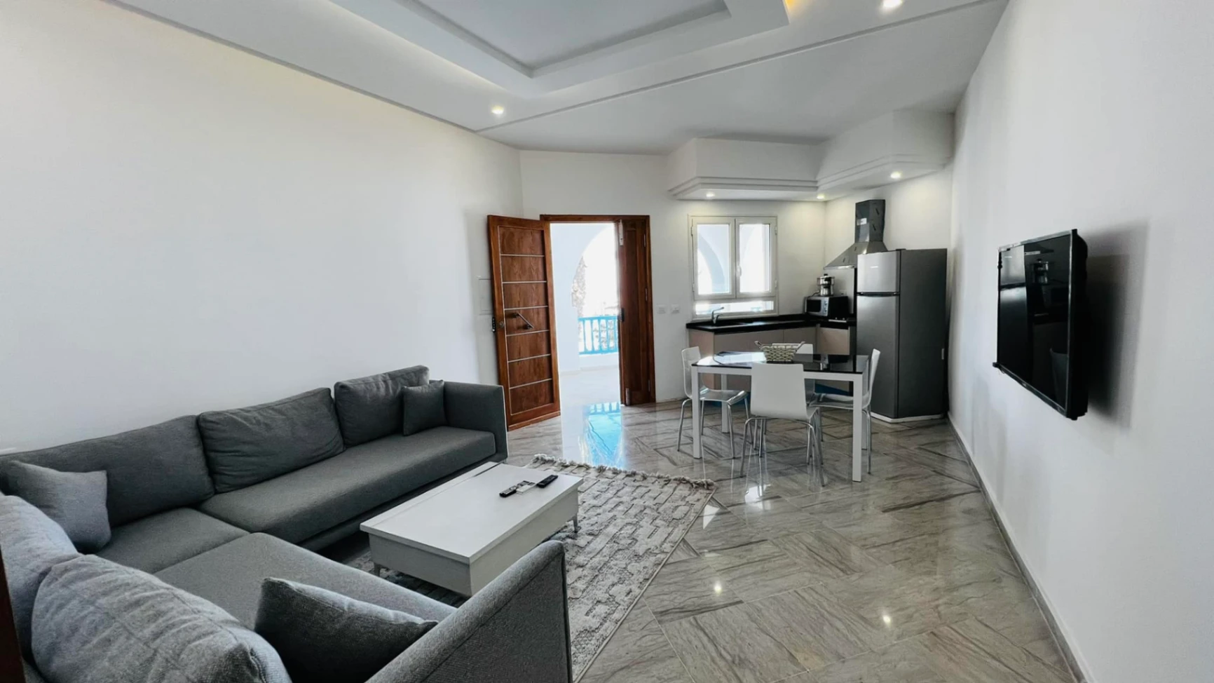 Appartement S+2 haut standing situé à la Corniche de Houmt Souk, Djerba, à proximité du rond-point Le Grand Bleu. Idéalement implanté en bord de mer, il offre un cadre de vie moderne, confortable et lumineux. L’appartement comprend deux chambres à co...