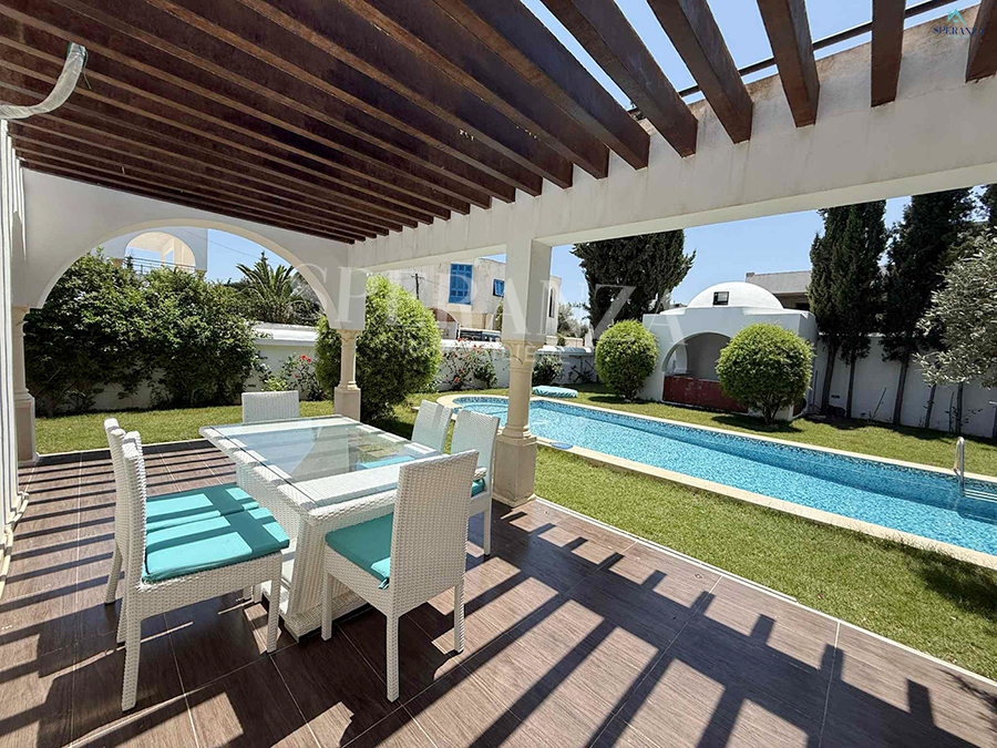 Cette villa RDC se situe à Hammamet sud (sidi hamed ). L'entrée principale se bénéficie d'un jardin gazonné qui offre plusieurs espaces .La partie jour est composée principalement d'un salon spacieux,se jour,une cuisine bien équipée avec des espace...